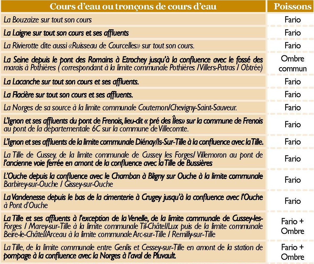 Le prélèvement de la truite fario et/ou de l’ombre sont interdit sur les cours d’eau suivant: